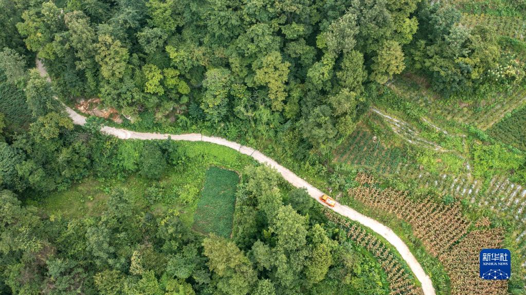 收購辣椒的小貨車行駛在貴州省湄潭縣梭塘村的鄉(xiāng)間小路上(8月29日攝,無人機(jī)照片)。新華社記者 陶亮 攝