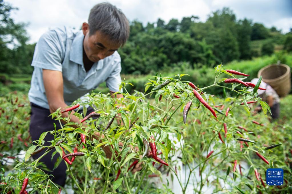 李偉在貴州省湄潭縣梭塘村采收辣椒(8月29日攝)。新華社記者 陶亮 攝