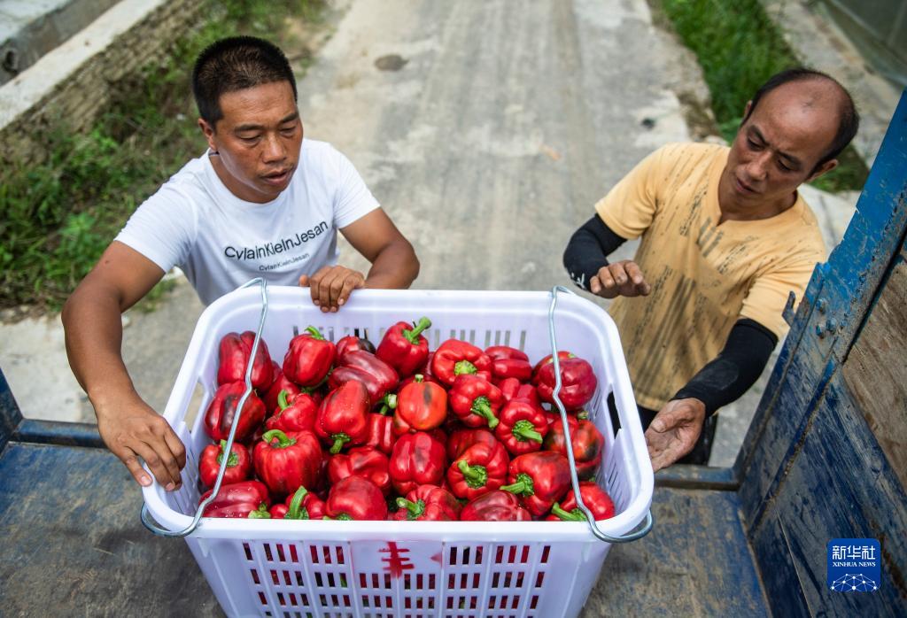 當(dāng)?shù)卮迕裨谫F陽農(nóng)投集團(tuán)花溪蔬菜基地將采收好的柿子椒裝車(7月30日攝)。新華社記者 陶亮 攝