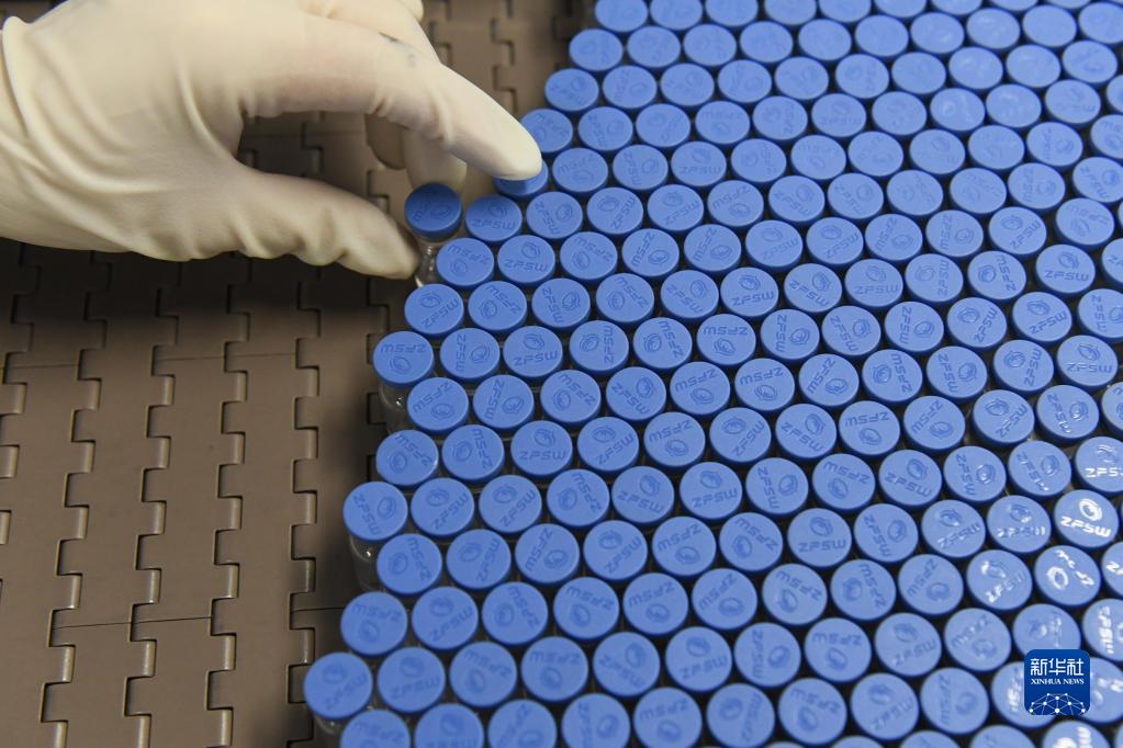 在安徽智飛龍科馬生物制藥有限公司新冠疫苗生產(chǎn)線上,工作人員對疫苗進(jìn)行人工檢測(5月20日攝)。新華社記者 黃博涵 攝