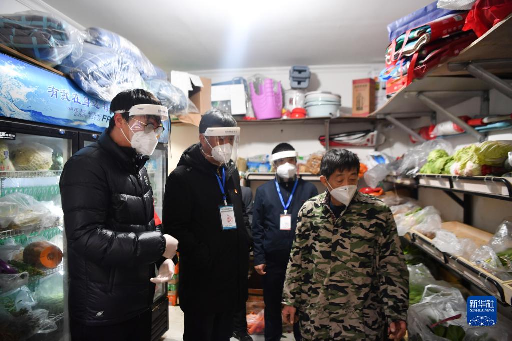 12月27日,在西安市雁塔區(qū)孟村小區(qū),盧晨陽(左一)與社區(qū)工作人員查看商鋪物資儲備情況。新華社記者 張博文 攝