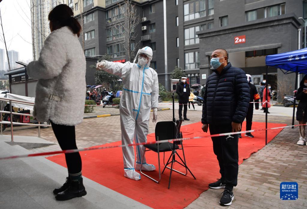 12月27日,在西安市雁塔區(qū)孟村小區(qū),盧晨陽(左二)引導居民進行核酸檢測。新華社記者 張博文 攝