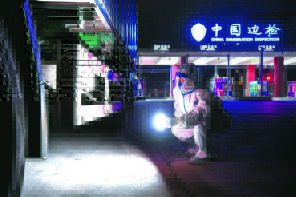 27日,記者在東興高速路口楠木山邊境檢查站看到,廣西防城港邊境管理支隊的執(zhí)勤民警身穿防護服,有條不紊地對車輛人員進行檢查,引導運送抗疫物資和人員的車輛有序進入檢查站。