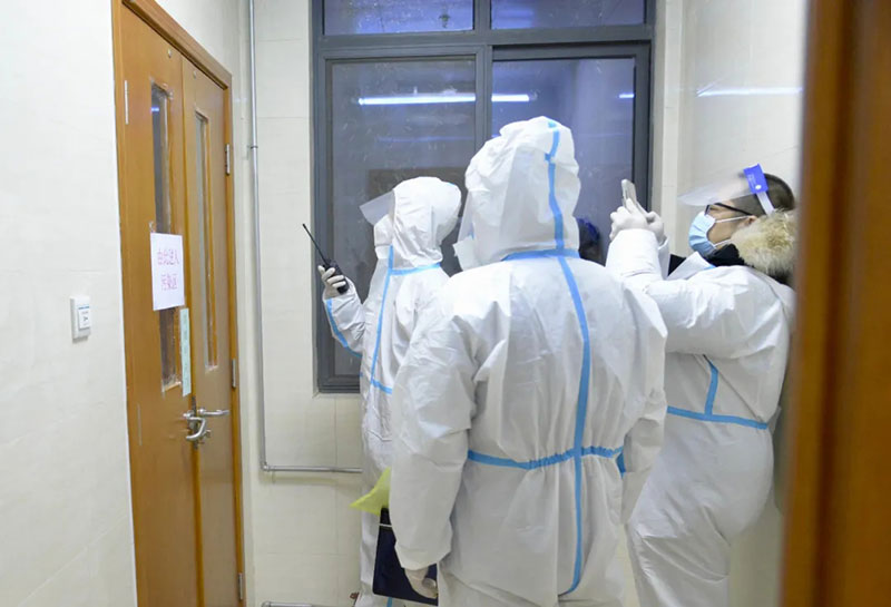 2022年1月4日,人民日?qǐng)?bào)社記者原韜雄(左一)在新冠確診病例收治點(diǎn)西安市胸科醫(yī)院采訪。