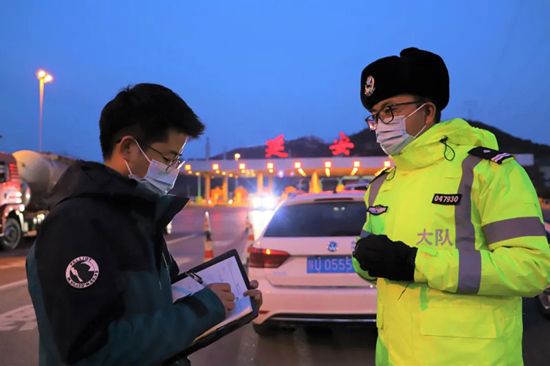 2021年12月24日,陜西日?qǐng)?bào)社延安站記者陳宏江(左)在延安北高速公路口疫情防控檢查站采訪執(zhí)勤交警。