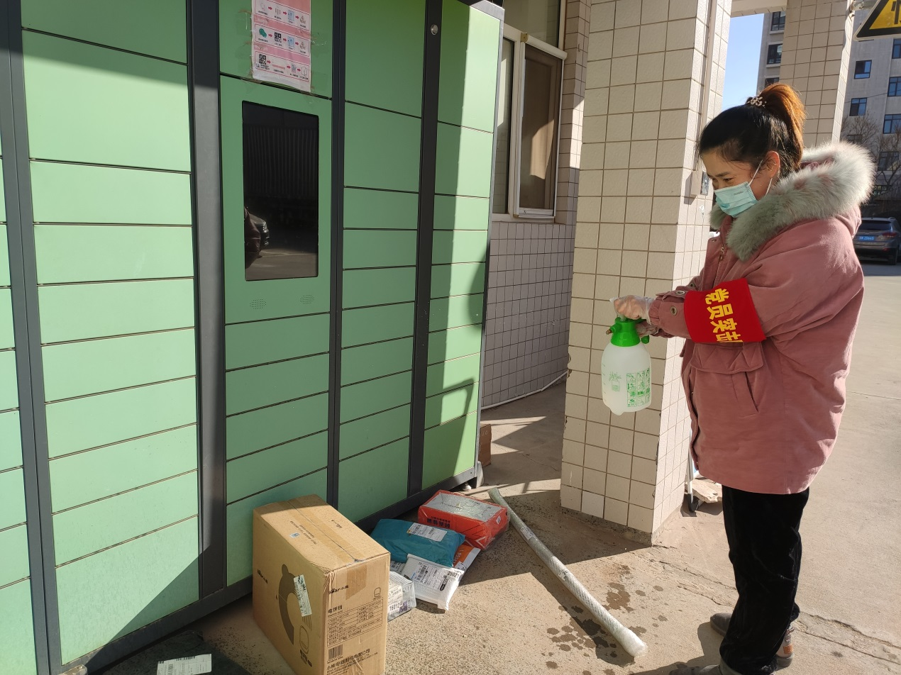 黨員突擊隊隊員索媛在值守小區(qū)對快遞進(jìn)行消毒