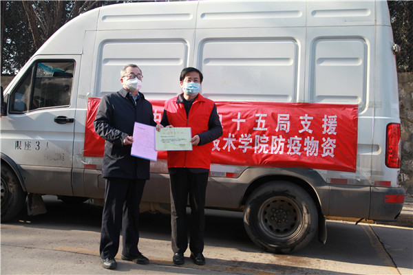 1月11日下午15:00,在陜西職業(yè)技術(shù)學(xué)院舉行簡短捐贈儀式,陜西職業(yè)技術(shù)學(xué)院黨委副書記、院長劉勝輝,黨委副書記、紀(jì)委書記何軍,副院長王慶等參加了捐贈儀式。劉勝輝代表學(xué)院黨委向我公司表示感謝,他表示,在疫情防控的關(guān)鍵時刻,水電十五局一周內(nèi)2批次送來價值近28萬元生活物資,及時緩解更極大充實和豐富了我??挂呱钗镔Y,為我院師生樹立了光輝榜樣,堅定了共克時艱的信心和決心。何軍向公司黨委副書記、紀(jì)委書記、工會主席任志宏贈送了捐款證明和感謝信。任志宏表示,水電十五局作為駐陜央企,一直以來,堅決貫徹落實黨中央決策部署,主動響應(yīng)陜西省委組織部和省國資委號召,面對此次疫情,將積極踐行央企擔(dān)當(dāng),履行社會責(zé)任,用實際行動為西安高校疫情防控貢獻(xiàn)一份力量!
