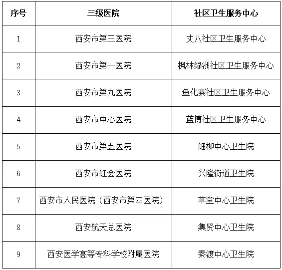 指定市屬三級醫(yī)院9家,對口支援高新區(qū)9個社區(qū)衛(wèi)生服務中心(或鄉(xiāng)鎮(zhèn)衛(wèi)生院,下同)(對口支援關(guān)系見附件),簽訂對口支援協(xié)議,下派內(nèi)科、外科、婦產(chǎn)科醫(yī)務人員駐點社區(qū)衛(wèi)生服務中心坐診,另外由西安市兒童醫(yī)院、西安市中醫(yī)醫(yī)院向丈八社區(qū)衛(wèi)生服務中心、楓林綠洲社區(qū)衛(wèi)生服務中心、魚化寨社區(qū)衛(wèi)生服務中心、藍博社區(qū)衛(wèi)生服務中心派中醫(yī)醫(yī)師和兒科醫(yī)師,確保社區(qū)衛(wèi)生服務中心能順利開展基本診療工作。高新區(qū)要加強社區(qū)衛(wèi)生服務中心硬件建設,配備必要的檢查、檢驗設備,確保能夠完成基本醫(yī)療所必需的檢查和檢驗項目。支援醫(yī)院與社區(qū)衛(wèi)生服務中心建立上下轉(zhuǎn)診關(guān)系,對超出社區(qū)衛(wèi)生服務中心診療能力的轉(zhuǎn)往上級醫(yī)院進一步診治,支援醫(yī)院應采取預約門診、綠色通道或預留床位等方式做好支持。