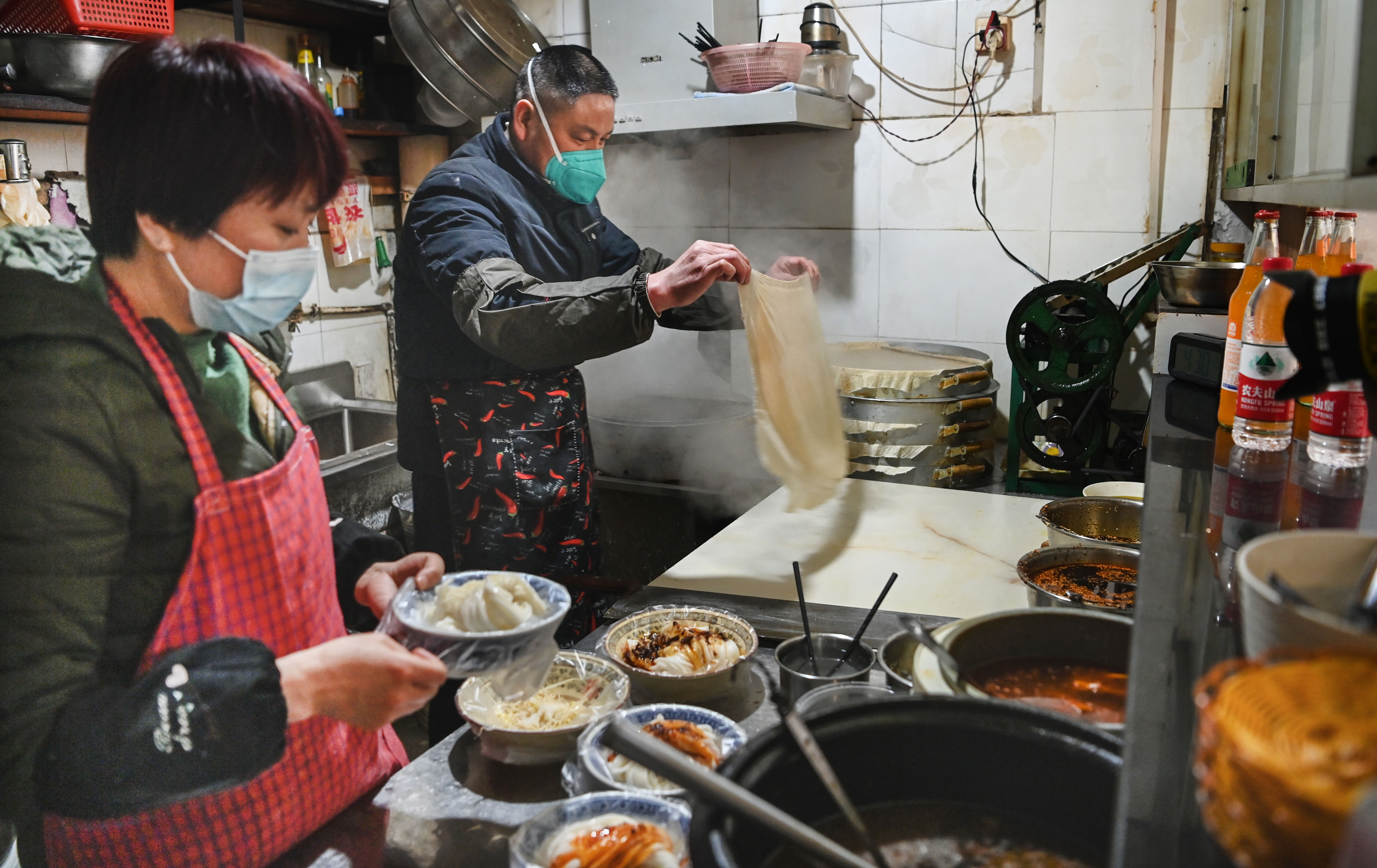 1月17日,西安市未央?yún)^(qū)一家小吃店開(kāi)始營(yíng)業(yè),為附近居民送餐上門(mén)。新華社記者 陶明 攝
