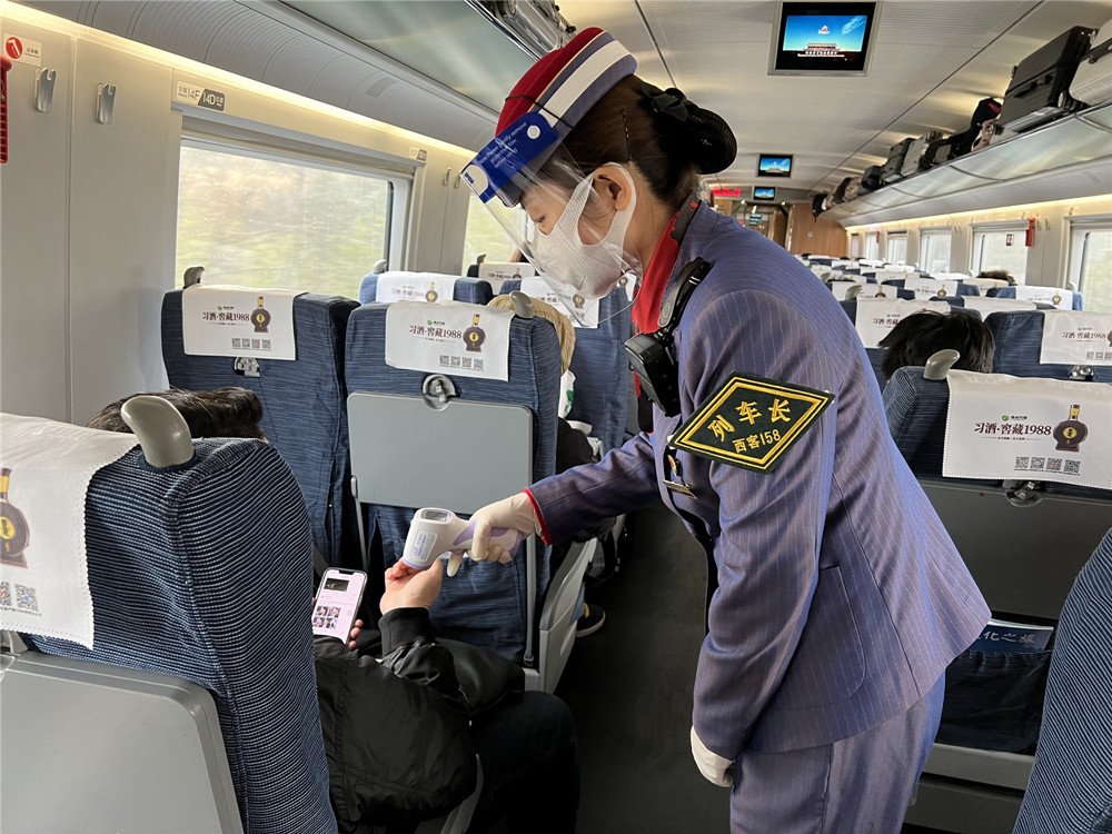 西安“高鐵先鋒”給乘客測(cè)體溫。