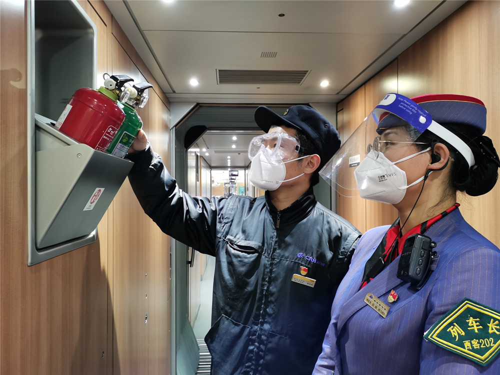 西安“高鐵先鋒”檢查車內(nèi)消防設(shè)備。