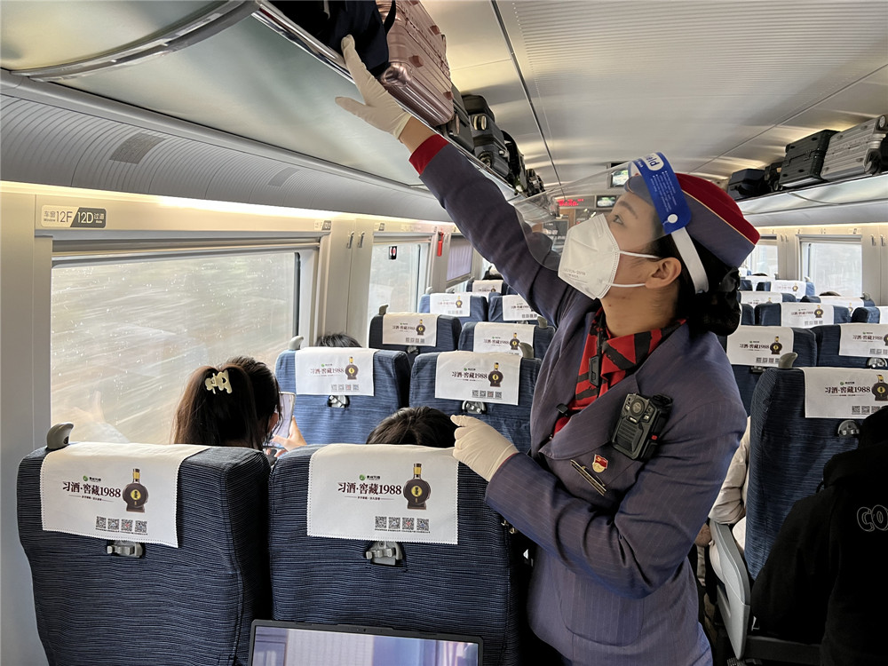 西安“高鐵先鋒”查看乘客行李是否安置好。