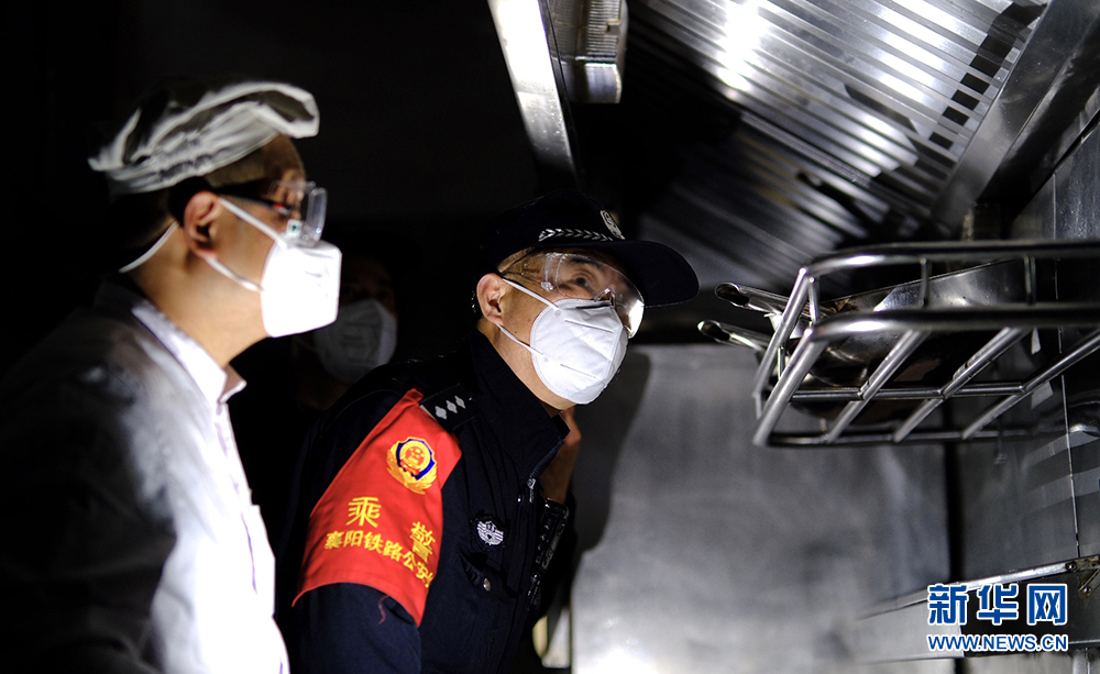 乘警蔣大兵檢查列車餐車消防安全情況。新華網(wǎng)發(fā) 賀瑞明攝