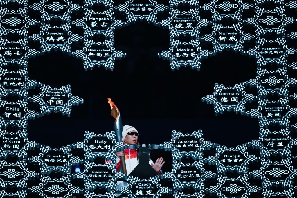 3月4日,最后一棒火炬手李端在北京2022年冬殘奧會(huì)開(kāi)幕式上摸索火炬嵌入的位置。新華社記者李尕?cái)z