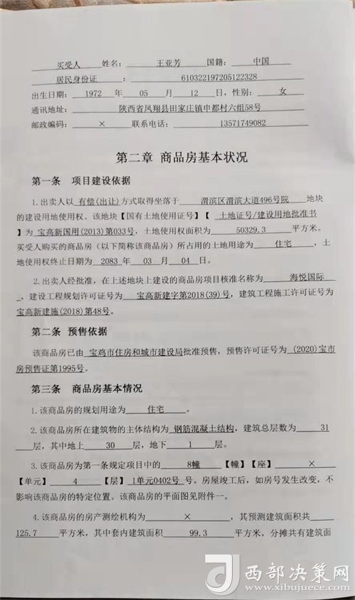 決策熱線|寶雞市民王女士(化名):我于2021年3月在寶雞市高新區(qū)渭濱大道臻和天下看了一套住宅樓,覺得地段位置也好。經(jīng)過和家人一起商議,與售樓人員確定了8幢1單元4層?xùn)|戶南北通透的房子,于2021年3月18日簽訂書面商品房買賣合同,于2021年4月15日簽訂按揭貸款合同給開發(fā)商交清了房款,前期共花費七十余萬。