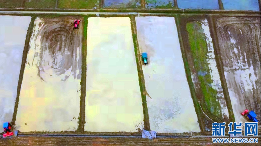 在江西省宜春市袁州區(qū)新田鎮(zhèn)里光村的水田里,數(shù)十臺(tái)拖拉機(jī)齊上陣,在春天的田野上描繪出一幅幅“鐵牛鬧春圖”。新華網(wǎng)發(fā) 張文 攝