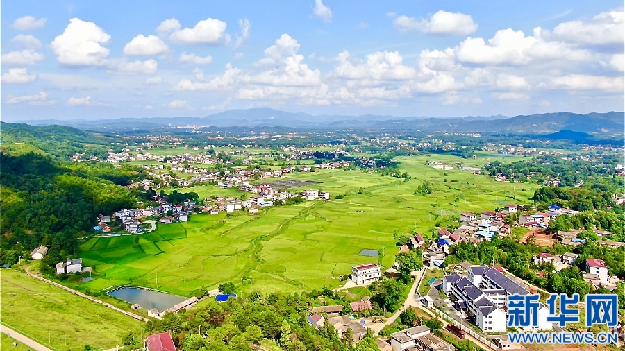 在江西省宜春市袁州區(qū)慈化鎮(zhèn)模山村,高標(biāo)準(zhǔn)農(nóng)田內(nèi)水網(wǎng)縱橫交錯(cuò),與村落、遠(yuǎn)山形成一幅美麗動(dòng)人的鄉(xiāng)村畫卷。新華網(wǎng)發(fā) 劉卿 攝