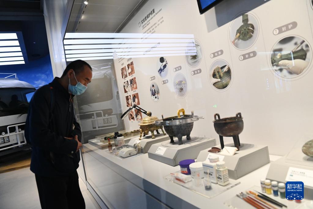 4月28日,游客在陜西考古博物館內(nèi)了解文物的實驗室保護修復(fù)。新華社記者 李一博 攝