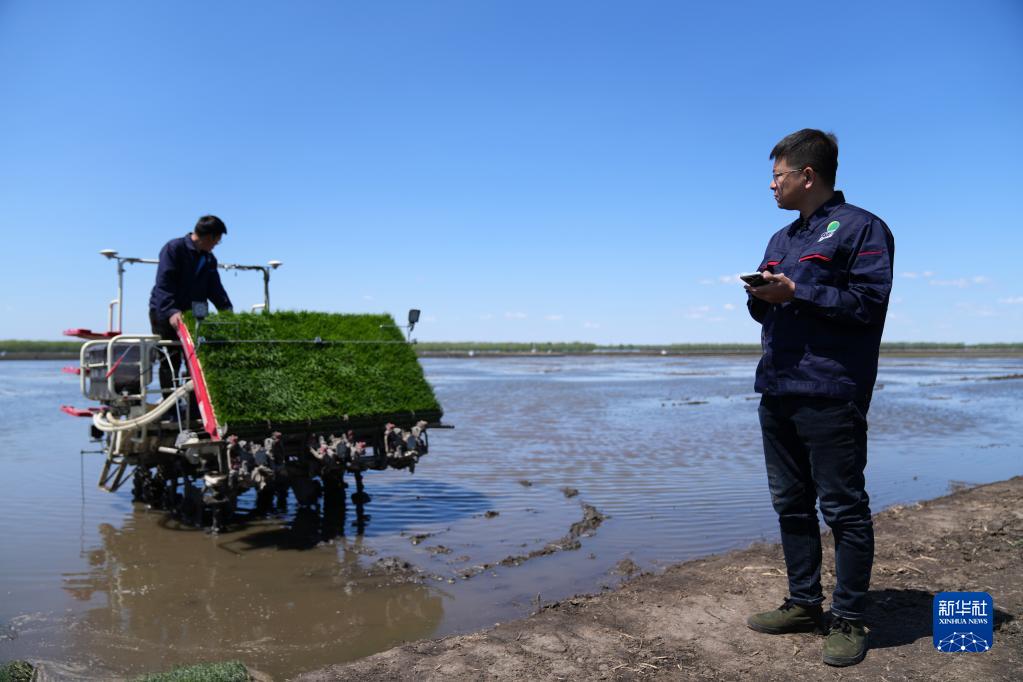 在北大荒集團建三江分公司七星農(nóng)場有限公司萬畝稻田邊,農(nóng)機手陸向?qū)нB續(xù)輕觸兩下手機,一臺帶有北斗導(dǎo)航系統(tǒng)的無人駕駛插秧機開始作業(yè)。