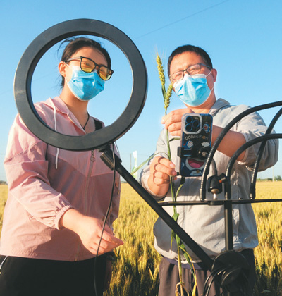 在山東省聊城市東昌府區(qū)閆寺街道周店村小麥良種繁育展示基地,負(fù)責(zé)技術(shù)的當(dāng)?shù)厍嗄暝趯π←溒贩N進(jìn)行直播推介。 |