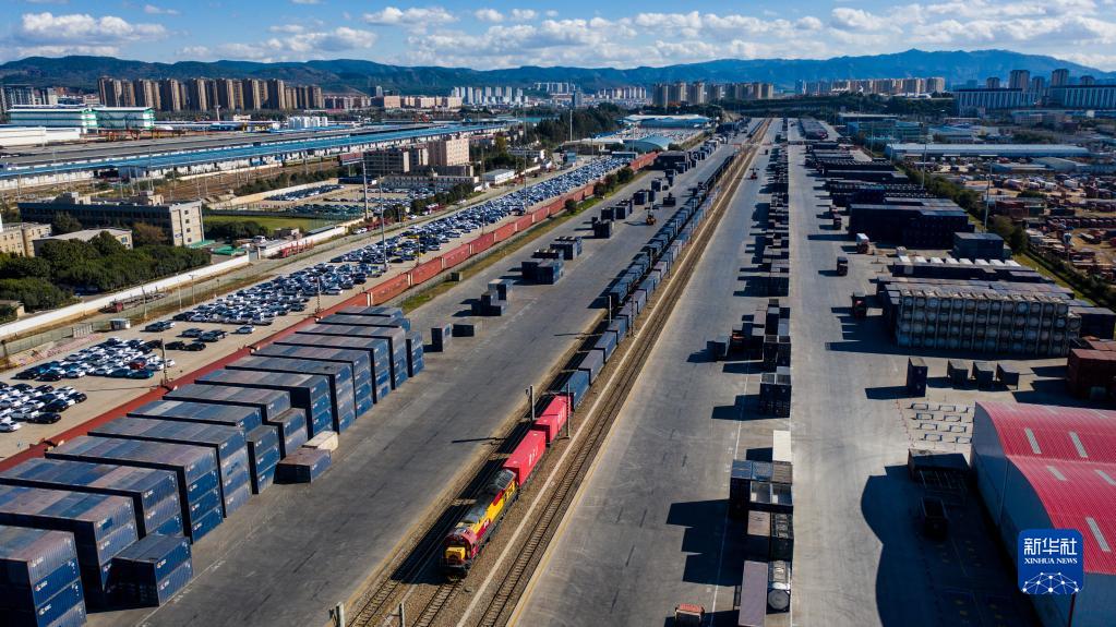 中老鐵路新年首趟國(guó)際貨物列車(前)從昆明開(kāi)往老撾萬(wàn)象(無(wú)人機(jī)照片,1月1日攝)。新華社記者 胡超 攝