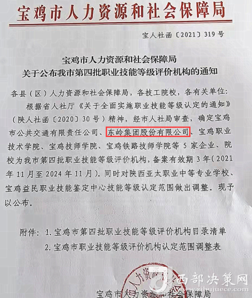 為了建立技能人才培養(yǎng)管理的長效機(jī)制,東嶺集團(tuán)積極與省市人社等相關(guān)部門對接,積極創(chuàng)造內(nèi)部條件,于2021年取得了“寶雞市第四批職業(yè)技能等級評價機(jī)構(gòu)”認(rèn)證資質(zhì),公司可以自主開展技能人才評價工作,頒發(fā)與國家職業(yè)資格證書同等效用的職業(yè)技能等級證書。取得證書后的學(xué)員,除了政府有1500元(中級)、2000元(高級)的現(xiàn)金補(bǔ)貼,公司也會根據(jù)實(shí)際情況提薪升職。