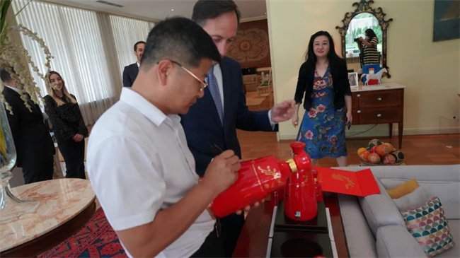 6月27-30日,由陜西西鳳酒股份有限公司主辦的“鳳香彌久傳遞友誼,合志同方共話未來——紅西鳳走進大使館”系列活動在京成功開展。6月28日下午,陜西西鳳酒股份有限公司副總經(jīng)理高洪濤一行抵達葡萄牙駐華大使官邸,與葡萄牙駐華大使杜傲杰進行了深入的溝通交流,積極尋找文化共通點,加速推動中國白酒國際化。高洪濤與在場嘉賓分享西鳳酒所蘊含的歲月沉淀、醇香典雅的悠久文化,分享西鳳品牌發(fā)展過程中的動人故事。陜西西鳳酒股份有限公司品牌管理部部長姜承輝及隨行人員參加了此次活動。