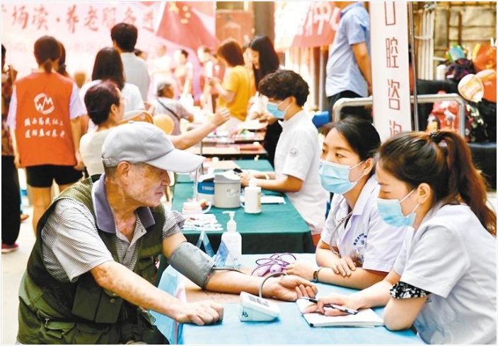 在蓮湖區(qū)安定坊小區(qū)的養(yǎng)老早市上,志愿者為老人提供義診服務。 (記者 王旭東 攝 資料圖片)