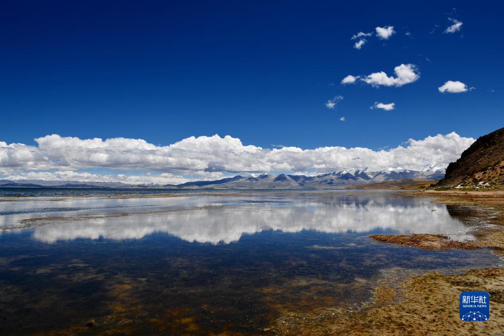 藍(lán)天白云下的瑪旁雍錯(8月2日攝)。新華社記者 張汝鋒 攝