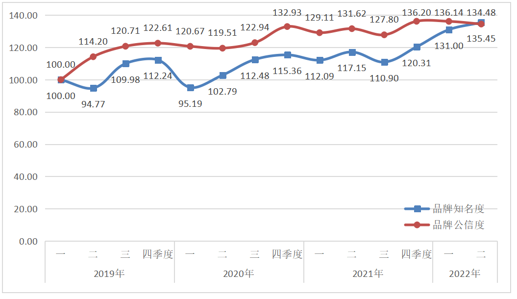 西鳳酒品牌傳播力指數(shù)2022年二季度運(yùn)行監(jiān)測顯示,西鳳酒品牌傳播力略有提升,達(dá)到134.96點(diǎn)。通過節(jié)日宣傳、交流拜訪、基酒項目建設(shè)等活動,西鳳酒品牌知名度和品牌公信度分別達(dá)到135.45點(diǎn)和134.48點(diǎn)。
