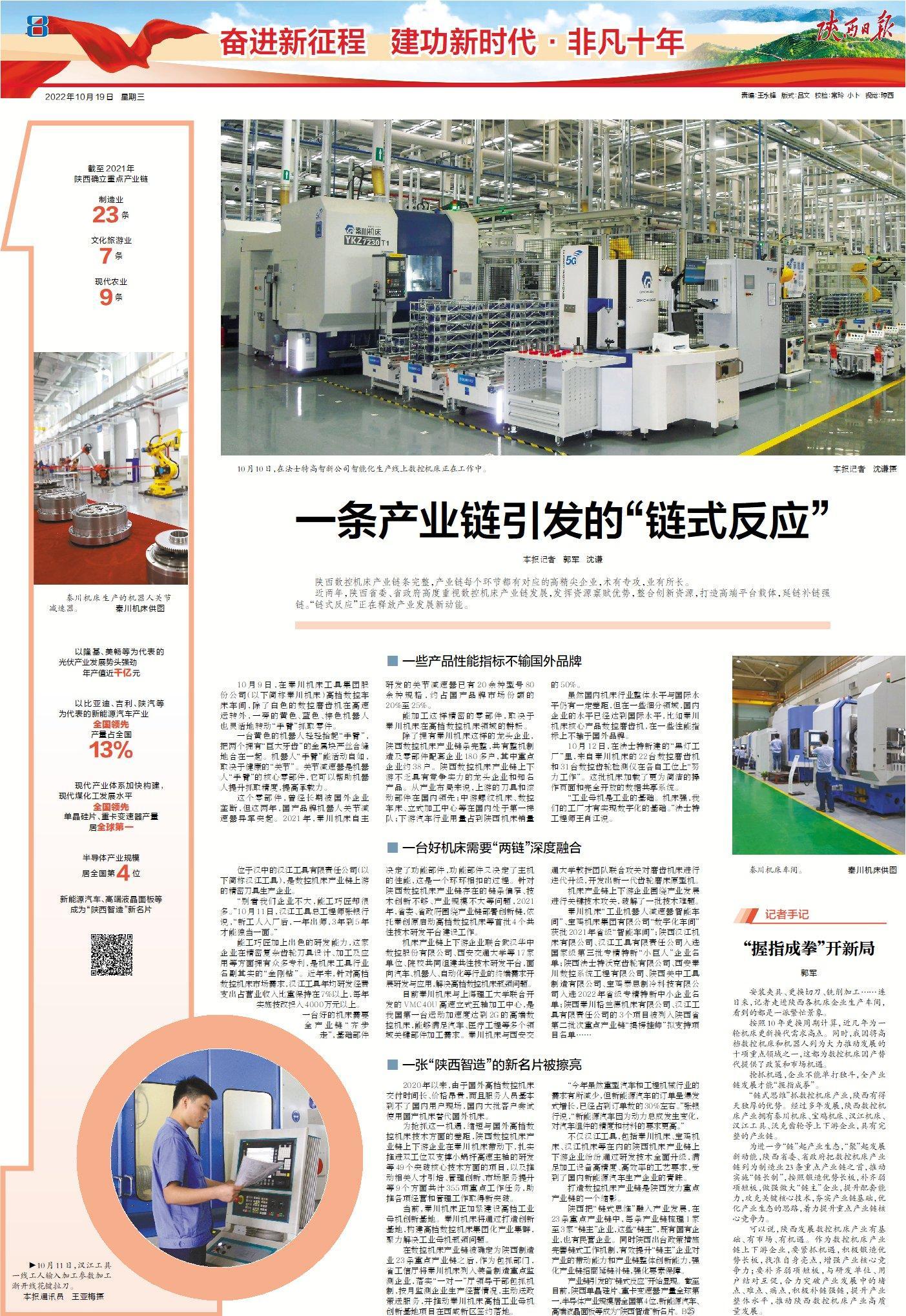 近兩年,陜西省委、省政府高度重視數(shù)控機(jī)床產(chǎn)業(yè)鏈發(fā)展,發(fā)揮資源稟賦優(yōu)勢,整合創(chuàng)新資源,打造高端平臺載體,延鏈補(bǔ)鏈強(qiáng)鏈。“鏈?zhǔn)椒磻?yīng)”正在釋放產(chǎn)業(yè)發(fā)展新動能。