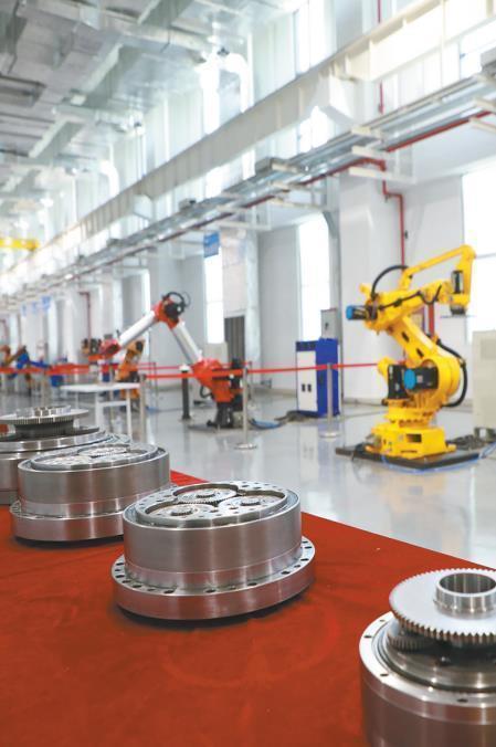 一臺黃色的機(jī)器人輕輕抬起“手臂”,把兩個擁有“巨大牙齒”的金屬塊嚴(yán)絲合縫地合在一起。機(jī)器人“手臂”能活動自如,取決于健康的“關(guān)節(jié)”。關(guān)節(jié)減速器是機(jī)器人“手臂”的核心零部件,它可以幫助機(jī)器人提升抓取精度,提高承載力。