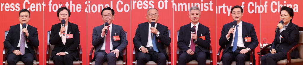 10月19日,中國共產(chǎn)黨第二十次全國代表大會新聞中心舉行集體采訪。重慶、四川、貴州、云南、西藏、陜西、甘肅代表團新聞發(fā)言人出席,介紹代表團學(xué)習(xí)討論二十大報告情況,并回答記者提問(拼版照片)。新華社記者 張玉薇 攝
