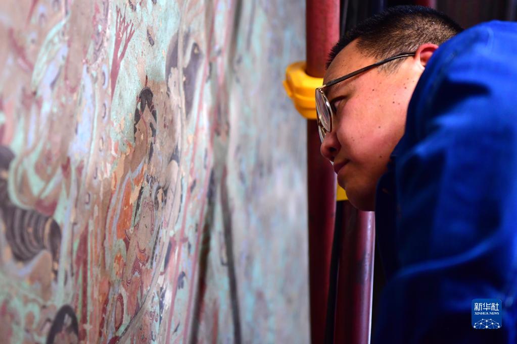 在莫高窟第231窟,敦煌研究院文物保護(hù)技術(shù)服務(wù)中心的壁畫修復(fù)工作者在修復(fù)出現(xiàn)病害的壁畫(2022年4月19日攝)。新華社記者 杜哲宇 攝