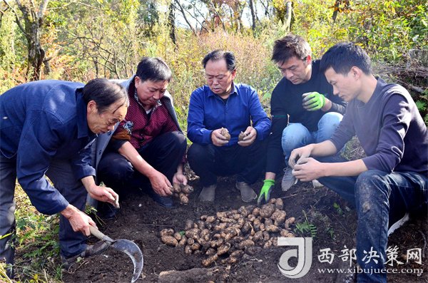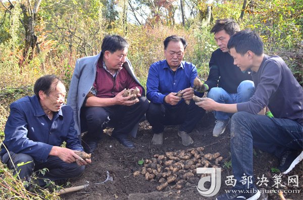 10月18日,寧強縣陽平關鎮(zhèn)伍家壩村第一書記唐賢斌(右三)正在天麻基地查看天麻的收成等情況。