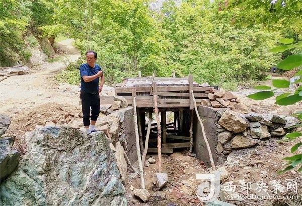 寧強縣陽平關鎮(zhèn)伍家壩村第一書記唐賢斌冒著酷暑在查看修建便民橋。