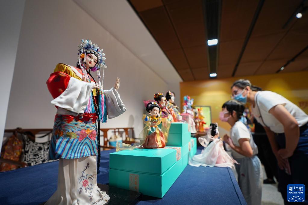 觀眾在中國(guó)工藝美術(shù)館觀看北京絹人工藝品(2022年9月10日攝)。新華社記者 陳鐘昊 攝