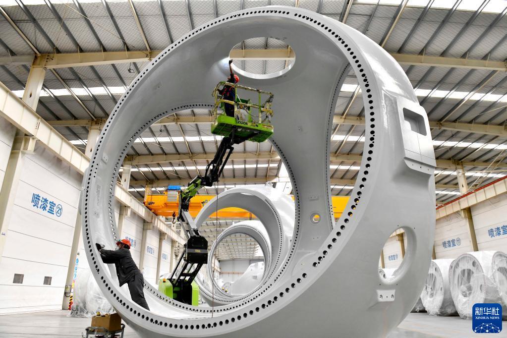 在山東省惠民縣風(fēng)電裝備產(chǎn)業(yè)基地涂裝車間,工作人員對(duì)風(fēng)電輪轂進(jìn)行涂裝(2022年6月7日攝)。新華社記者 郭緒雷 攝