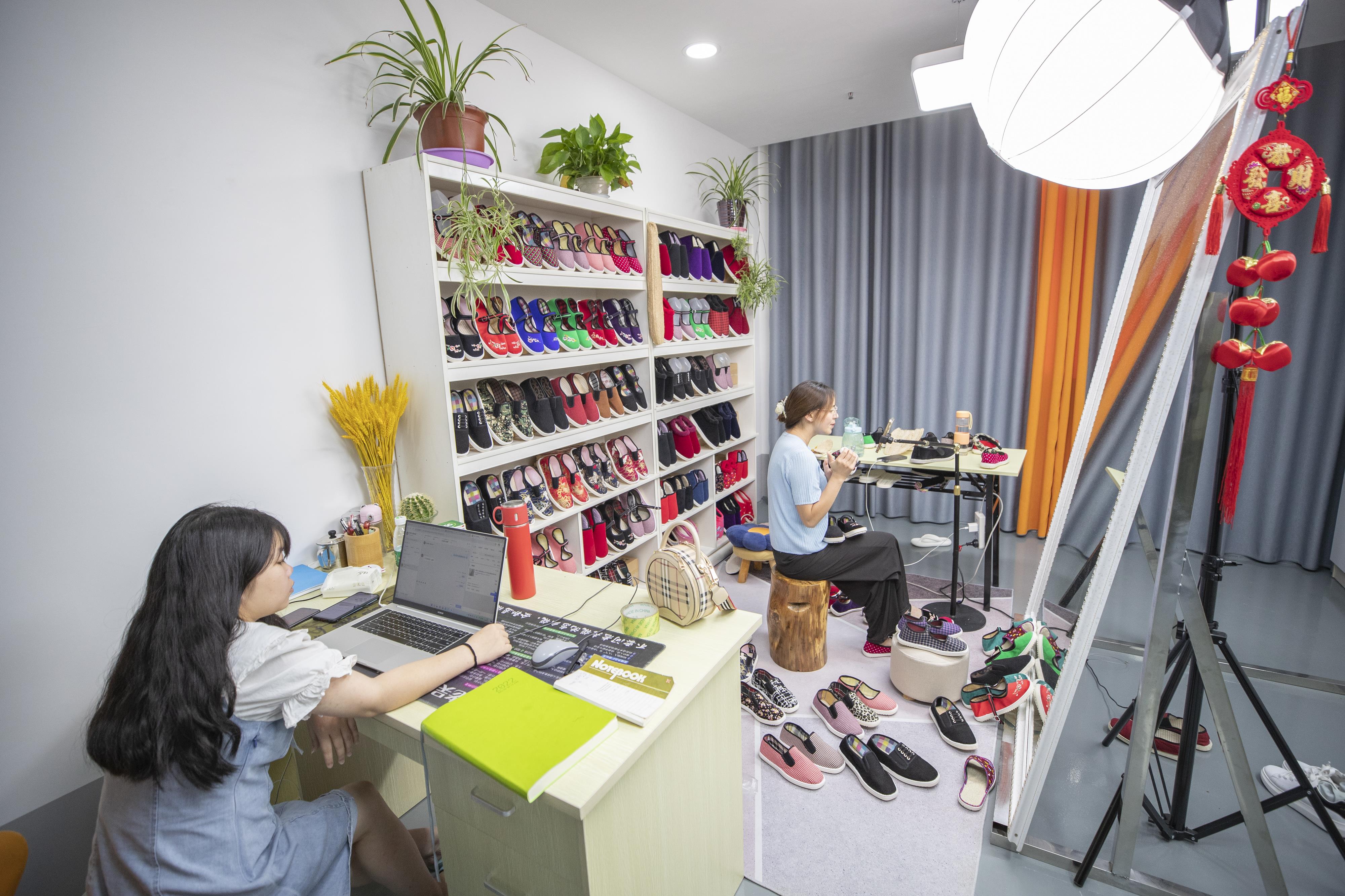2022年8月20日,在重慶市巫溪縣文峰鎮(zhèn)農(nóng)民工返鄉(xiāng)創(chuàng)業(yè)園,重慶何航鞋業(yè)有限公司的主播們?cè)谙蛑辈ラg粉絲們推介各色布鞋。新華社記者 黃偉 攝