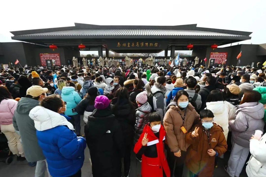 1月23日(大年初二),秦始皇帝陵博物院迎來了最大承載量,來自全國各地的觀眾參觀熱情高漲,該院內(nèi)外重現(xiàn)了久別的客流高峰。兵馬俑園區(qū)人山人海,熙熙攘攘,觀眾都在有序排隊進行參觀。13時,秦始皇帝陵博物院已經(jīng)達到最大承載量,所有門票售罄,院方充分感受到了大家的熱情。