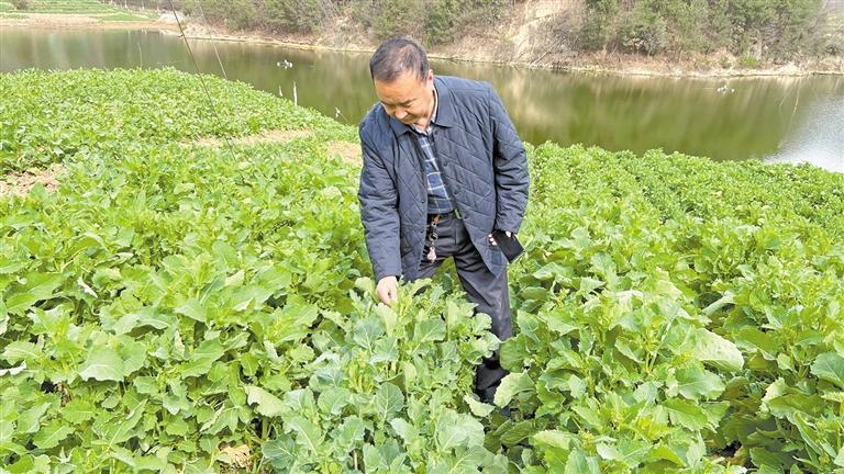 3月1日,周應(yīng)軍在漢中市南鄭區(qū)的制種田查看油菜生長情況。 記者 趙茁軼攝