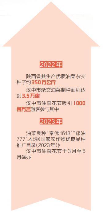 陜西是雜交油菜種業(yè)強(qiáng)省,雜交油菜育種研究和產(chǎn)業(yè)化開發(fā)一直走在全國前列。2022年,陜西省制定《油菜產(chǎn)業(yè)綠色革命科技三年行動實(shí)施方案》,取得明顯成效。陜西省去年全年共生產(chǎn)優(yōu)質(zhì)油菜雜交種子約350萬公斤。勉縣、城固縣、洋縣入選全國油菜產(chǎn)業(yè)綠色革命科技示范縣;陜西農(nóng)業(yè)科研單位培育的油菜良種“秦優(yōu)1618”“邡油777”入選2022年國家糧油生產(chǎn)主導(dǎo)品種和《國家農(nóng)作物優(yōu)良品種推廣目錄(2023年)》;漢中市農(nóng)業(yè)農(nóng)村局啟動糧油“百千萬”豐產(chǎn)示范工程,在全市11個縣(區(qū))建立油菜優(yōu)良品種和綠色高產(chǎn)高效生產(chǎn)技術(shù)百畝示范點(diǎn)56個8100畝、千畝示范片23個2.9萬畝、萬畝示范帶9個10.5萬畝;漢中市南鄭區(qū)和勉縣被農(nóng)業(yè)農(nóng)村部認(rèn)定為國家級油菜制種大縣。漢中市委、市政府提出“最強(qiáng)產(chǎn)業(yè)、最優(yōu)種業(yè)、最美花海”的發(fā)展戰(zhàn)略,以“花”為媒,將漢中市油菜花節(jié)打造成推動鄉(xiāng)村振興和發(fā)展文化旅游的重要載體。2022年,1000余萬名游客前來觀光旅游或參與線上活動。“油菜經(jīng)濟(jì)”堪稱陜西的一張金色名片。