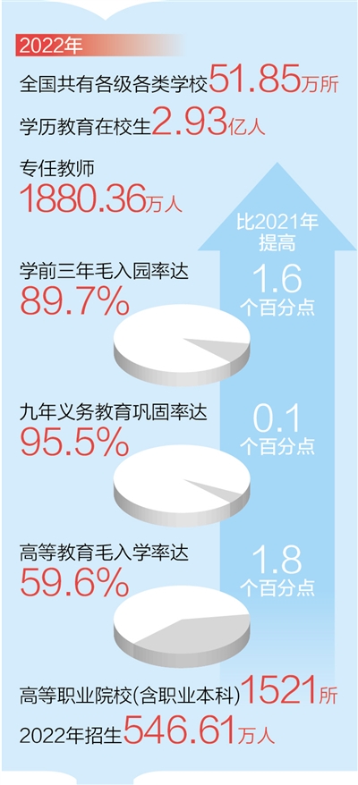 ——普及鞏固水平進一步提升。全國學前三年毛入園率達到89.7%,比2021年提高1.6個百分點;九年義務教育鞏固率達95.5%,高中階段毛入學率達到91.6%。