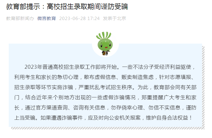據(jù)悉,近年來,一些社會機構(gòu)和個人通過網(wǎng)絡(luò)平臺發(fā)布有關(guān)涉考涉招信息,存在政策解讀不準確、信息提供不真實等問題,有的甚至通過假冒、仿冒高校和招生考試機構(gòu)的官方網(wǎng)站、公眾賬號編造散布虛假信息,迷惑考生和家長,實施詐騙,嚴重擾亂考試招生秩序。