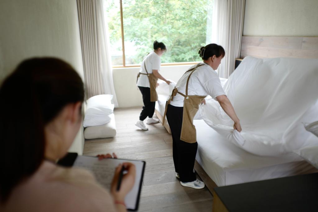 學員在莫干山民宿管家培訓中心內(nèi)進行房務(wù)考核。新華社記者徐中哲 攝