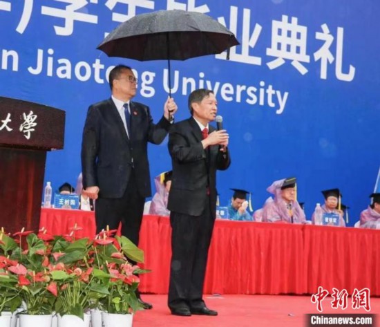 圖為西安交通大學畢業(yè)典禮當日,該校黨委書記盧建軍為校長王樹國撐傘?!∥靼步煌ù髮W供圖