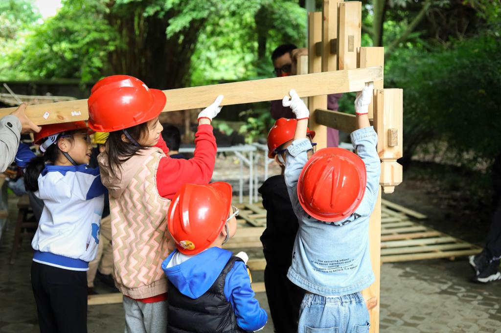 2023年4月22日,在成都市溫江區(qū)陳家桅桿建筑群,孩子們正在搭建川西古建模型。(嚴(yán)浩 攝)