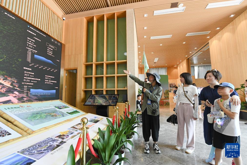 8月11日,游客在安吉余村未來鄉(xiāng)村展館了解當?shù)鼐G色用能情況。