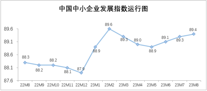8月中國中小企業(yè)發(fā)展指數(shù)為89.4,比7月上升0.1點(diǎn),這是繼6月、7月分別上升0.2點(diǎn)之后,連續(xù)第三個(gè)月上升。