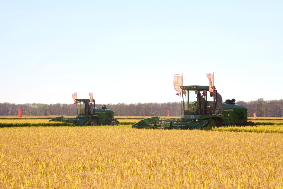 金秋九月,北大荒千里沃野一片金黃。在北大荒集團軍川農(nóng)場有限公司福源管理區(qū)水稻地塊,一臺臺收割機、割曬機正在進行收獲作業(yè)。種植戶楊明成在農(nóng)技人員的指導下率先開鐮,采取直收和割曬拾禾相結(jié)合的方式進行收獲。